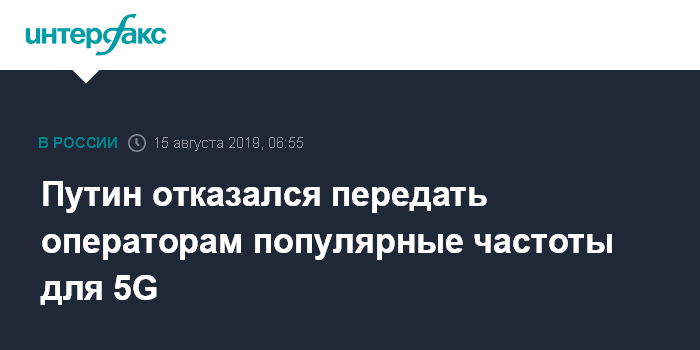 Москва. 15 августа. INTERFAX.RU - Президент РФ Владимир Путин не поддержал расчистку популярных частот 3,4-3,8 ГГц для развития сетей пятого поколения в России, сообщает в четверг газета "Ведомости" со ссылкой на источники.
