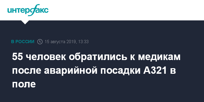 Москва. 15 августа. INTERFAX.RU - За медицинской помощью в результате аварийной посадки самолета "Уральских авиалиний" Airbus А321 в поле рядом с Жуковским обратились 55 человек, сообщили "Интерфаксу" в ГУ МЧС по Московской области.