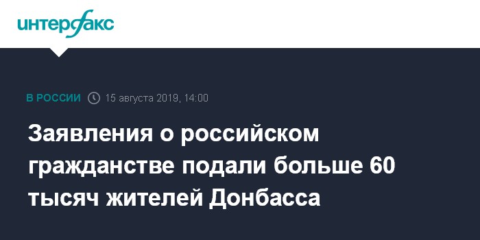 Москва. 15 августа. INTERFAX.RU - МВД России получило больше 60 тысяч заявлений с просьбой предоставить российское гражданство от жителей самопровозглашенных республик Донбасса. Гражданство по упрощенной процедуре получили больше 25 тысяч человек, сообщила глава Главного управления МВД по вопросам миграции Валентина Казакова.