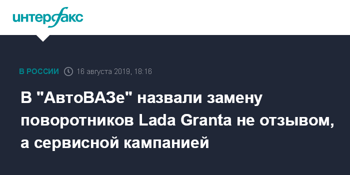 Москва. 16 августа. INTERFAX.RU - АО "АвтоВАЗ" не подтвердило отзыв более 11 тысяч автомобилей Lada Granta для замены поворотников, отмечая, что речь идет лишь о сервисной кампании по устранению дефектов.