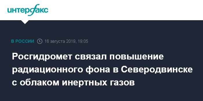 Москва. 16 августа. INTERFAX.RU - В Северодвинске скачок интенсивности гамма-излучения после взрыва 8 августа на полигоне ВМФ мог быть связан с прохождением облака радиоактивных инертных газов, считают специалисты Росгидромета. Об этом говорится в материалах учреждения.