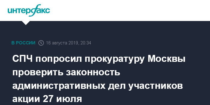 Москва. 16 августа. INTERFAX.RU - Совет по правам человека при президенте попросил Мосгорпрокуратуру проверить законность привлечения к административной ответственности участников несогласованной акции 27 июля. В СПЧ считают, что к задержанным неправильно применяли законодательство об административной ответственности, говорится в заявлении Совета.