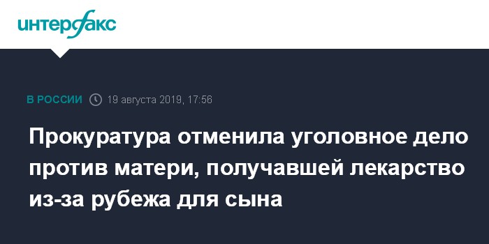 Москва. 19 августа. INTERFAX.RU - Транспортная прокуратура признала незаконным возбуждение уголовного дела в отношении женщины, получившей на почте заграничное лекарство для сына, страдающего эпилепсией, сообщил "Интерфаксу" официальный представитель Генпрокуратуры РФ Александр Куренной.