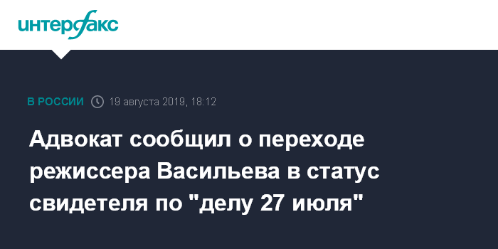 Москва. 19 августа. INTERFAX.RU - Режиссер Дмитрий Васильев, задержанный ранее по уголовному делу о массовых беспорядках в центре Москвы 27 июля, "перешел" в статус свидетеля, заявил "Интерфаксу" его адвокат Александра Зинуров.
