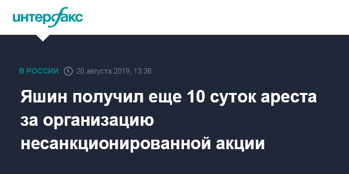 Хамовнический суд Москвы 8 августа назначил Яшину 10 суток административного ареста, признав его виновным в призывах к участию в несанкционированной акции 14 июля у Мосгоризбиркома (ч. 2 ст. 20 КоАП). До этого по 10 суток ареста за аналогичные правонарушения ему назначали Троицкий и Щербинский столичные суды.