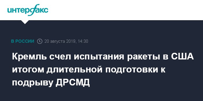 19 августа Пентагон провел испытание новой крылатой ракеты наземного базирования, характеристики которой идут вразрез с прекратившим действие ДРСМД. В военном ведомстве США отметили, что ракета стартовала с "наземной мобильной пусковой установки и точно поразила цель после более чем 500 км полета". В то же время в Пентагоне подчеркнули, что ракета была спроектирована для доставки обычных, а не ядерных боеголовок.