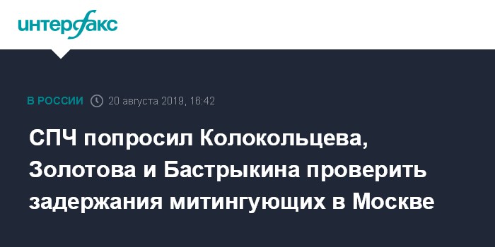 Москва. 20 августа. INTERFAX.RU - Совет по правам человека при президенте попросил руководителей МВД, Росгвардии и Следственного комитета проверить данные о неправомерном применении силы к участникам протестных акций в Москве 27 июля, 3 и 10 августа. В пресс-релизе СПЧ приведены конкретные случаи необоснованного, с точки зрения правозащитников, применения силы и спецсредств полицейскими и Росгвардией.