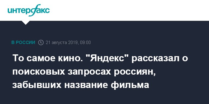 Москва. 20 августа. INTERFAX.RU - Поисковый сервис "Яндекс" выяснил, по каким ярким приметам россияне чаще всего пытаются найти в интернете позабытое название фильма. В основу исследования лег анализ 18 миллионов уникальных поисковых запросов за 2017-2019 годы.