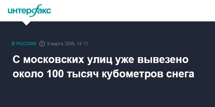 Москва. 9 марта. INTERFAX.RU - Начиная с ночи на понедельник и до настоящего времени, с московских улиц вывезено около 100 тыс. кубометров снега, сообщила "Интерфаксу" пресс-секретарь департамента жилищно-коммунального хозяйства и благоустройства Москвы Марина Орлова.