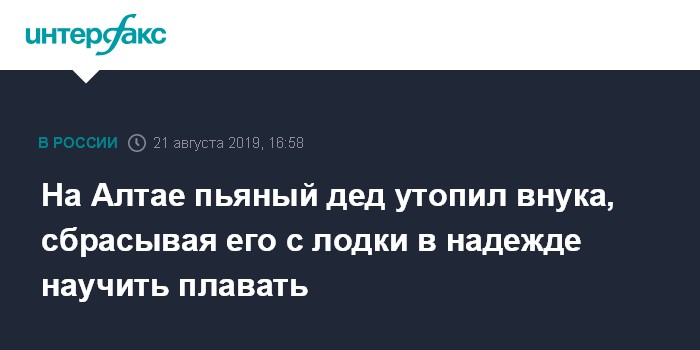 Москва. 21 августа. INTERFAX.RU - В Алтайском крае вблизи поселка Комсомольский мужчина пытался научить внука плавать, но в результате семилетний ребенок погиб.