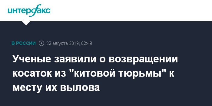 Москва. 22 августа. INTERFAX.RU - Все косатки, освобожденные из "китовой тюрьмы" в Приморском крае, вернулись к Шантарским островам, где их выловили, и успешно адаптируются в естественной среде обитания, сообщает пресс-служба Всероссийского НИИ рыбного хозяйства и океанографии (ВНИРО).