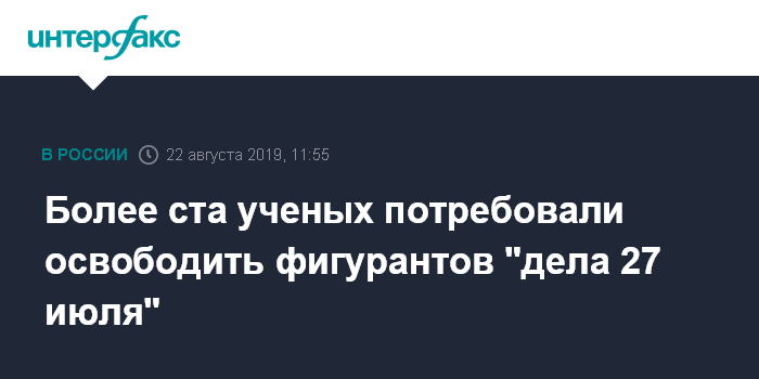 Москва. 22 августа. INTERFAX.RU - 112 российских ученых, работающих в российских вузах и за рубежом, потребовали освободить фигурантов "дела 27 июля", которых обвиняют в участии в массовых беспорядках, и прекратить их уголовное преследование. Их заявление опубликовала газета "Троицкий вариант". На 11:40 по Москве под ним было 112 подписей.