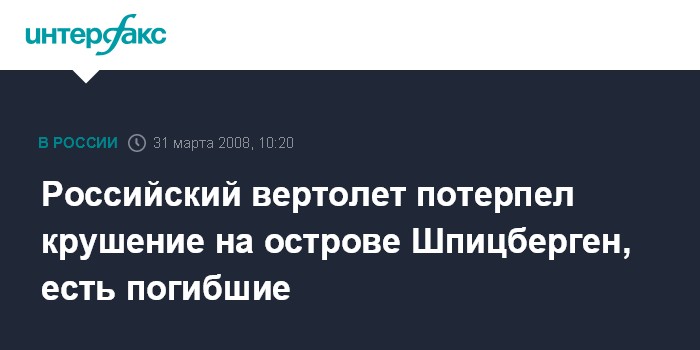 Москва. 31 марта. INTERFAX.RU - Hа Шпицбергене упал при заходе на посадку российский вертолет Ми-8 с девятью людьми на борту. Трое граждан России погибли, сообщает телеканал "Вести-24".