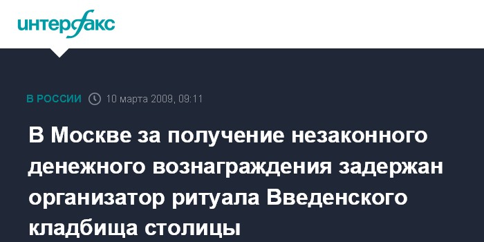 Москва. 10 марта. INTERFAX.RU - По подозрению в получении незаконного денежного вознаграждения задержан организатор ритуала Введенского кладбища, расположенного в Лефортово, - Юрий Науменко.