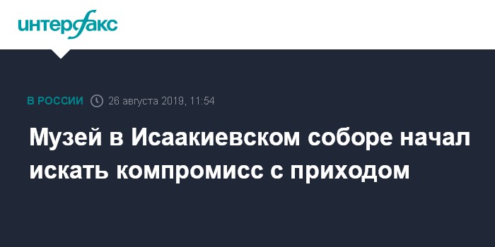 Москва. 26 августа. INTERFAX.RU - Руководство музея "Исаакиевский собор" пытается найти компромисс и согласовать работу учреждения после того, как приход изменил расписание богослужений в храме. "Это не сенсация, а рабочий вопрос", - добавил директор музея Юрий Мудров.