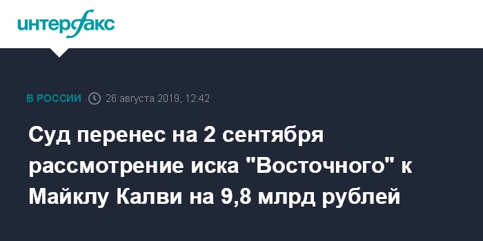 Суд перенес на 2 сентября рассмотрение иска "Восточного" к Майклу Калви на 9,8 млрд рублей