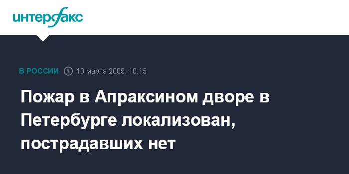 Москва. 10 марта. INTERFAX.RU - Локализован пожар, возникший во вторник утром в центре Петербурга в одном из строений Апраксина двора, сообщили "Интерфаксу" в ГУ МЧС по городу.