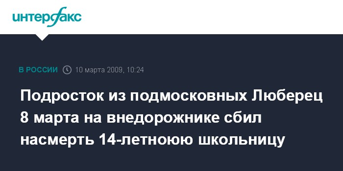 Москва. 10 марта. INTERFAX.RU - В подмосковных Люберцах задержан 14-летний подросток, сбивший в праздничный день 8 марта на автомобиле свою сверстницу из поселка Томилино.