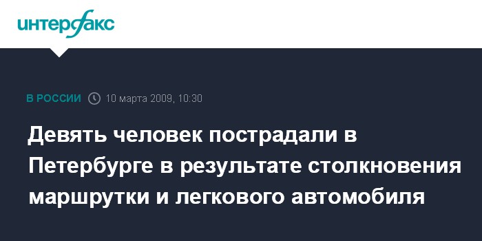 Москва. 10 марта. INTERFAX.RU - В Приморском районе Петербурга в ДТП с участием маршрутного такси и легкового автомобиля пострадали девять человек, сообщает пресс-служба Городской станции скорой помощи.