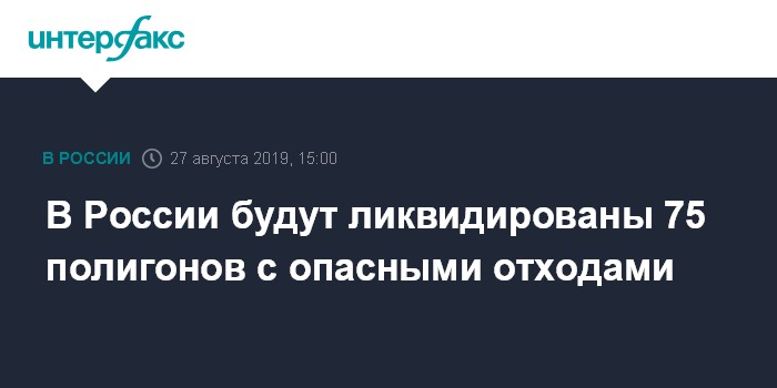 Москва. 27 августа. INTERFAX.RU - В России будут ликвидированы 75 полигонов с отходами, представляющие опасность для природы и человека. Такие мероприятия проведут в рамках национального проекта "Экология". Об этом заявил министр природных ресурсов и экологии РФ Дмитрий Кобылкин.