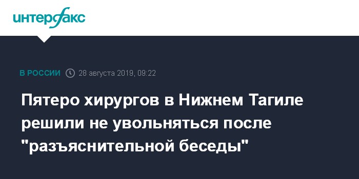 Москва. 28 августа. INTERFAX.RU - Пятеро хирургов в Нижнем Тагиле забрали заявление об увольнении, им проведут дополнительные выплаты за нагрузки и снимут эту нагрузку в будущем, сообщили в Минздраве РФ в среду.