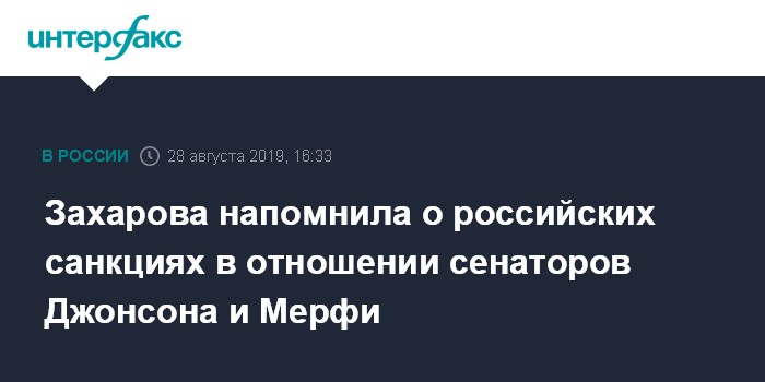 Москва. 28 августа. INTERFAX.RU - Американские сенаторы Рон Джонсон и Крис Мерфи находятся в российском "стоп-листе", их туда включили в качестве ответа на "необоснованные рестрикции" против российских членов Совета Федерации, напомнила представитель МИД России Мария Захарова.