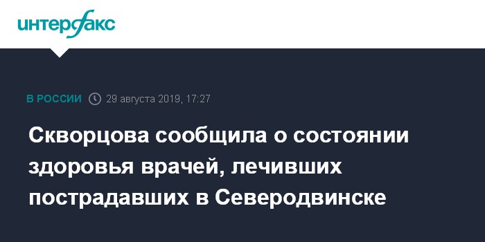 Москва. 29 августа. INTERFAX.RU - У нескольких врачей, занимавшихся лечением пострадавших в результате аварии в Северодвинске, были обнаружены изменения в организмах, но они не были связаны с воздействием радиации. Об этом на пресс-конференции в Москве заявила министр здравоохранения РФ Вероника Скворцова.