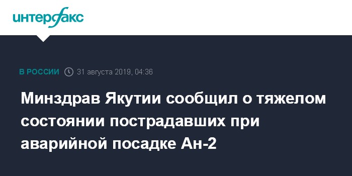 Москва. 31 августа. INTERFAX.RU - Четверо пострадавших в результате вынужденной посадки самолета Ан-2 в Якутии находятся в стабильно тяжелом состоянии, сообщает пресс-служба министерства здравоохранения республики.