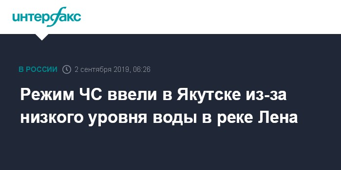 Москва. 2 сентября. INTERFAX.RU - Объявлен режим чрезвычайной ситуации в Якутске из-за низкого уровня воды в реке Лене и угрозы устойчивому водоснабжению города, сообщает пресс-служба администрации города.