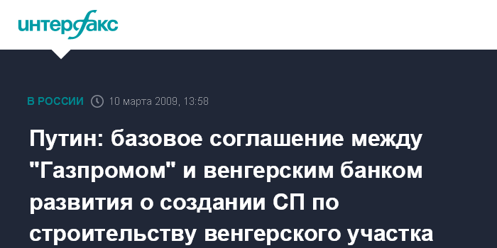 Москва. 10 марта. INTERFAX.RU - Премьер-министр РФ Владимир Путин заявил, что базовое соглашение о сотрудничестве между ОАО "Газпром" и ЗАО "Венгерский банк развития" о создании СП по строительству венгерского участка газопровода "Южный поток" готово к подписанию. "Считаю, что сегодня будет сделан важный шаг", - подчеркнул Путин, открывая российско-венгерские межправительственные консультации в Москве.