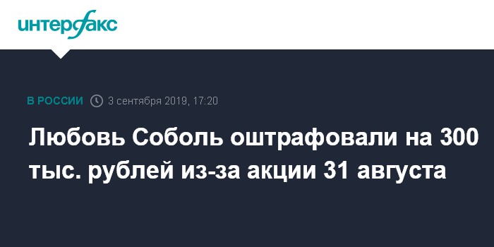 "Соболь признана виновной по ч.8 ст.20.2 КоАП (повторное нарушение правил организации митинга), ей назначено наказание в виде административного штрафа в размере 300 тысяч рублей", - сказала "Интерфаксу" пресс-секретарь суда Ксения Алексеева.