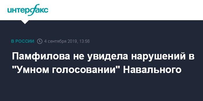 Москва. 4 сентября. INTERFAX.RU - Глава Центризбиркома Элла Памфилова заявила, что не видит нарушений в организации так называемого "Умного голосования", созданного сторонниками оппозиционера Алексея Навального, и рассматривает этот проект как вариант предвыборной агитации.