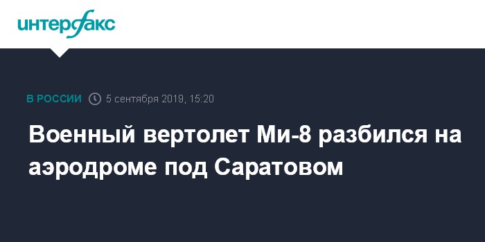В свою очередь Минобороны России сообщает, что Ми-8 опрокинулся при разгоне. "5 сентября 2019 года в Саратовской области при совершении разгона по взлетно-посадочной полосе для совершения планового полета произошло опрокидывание вертолета Ми-8. Экипаж вертолета сумел безопасно покинуть машину и не пострадал. Пассажиров на борту не было",- заявили в Минобороны РФ.