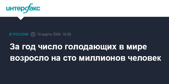 Москва. 10 марта. INTERFAX.RU - Более чем на 100 млн человек увеличилась в прошлом году "армия голодающих" в мире, сообщила верховный комиссар ООН по правам человека Наванетхем Пиллэй. Она отметила, что резкий рост цен на продовольствие в 2008 году привел к увеличению "армии голодающих" с 854 млн до 967 млн человек.