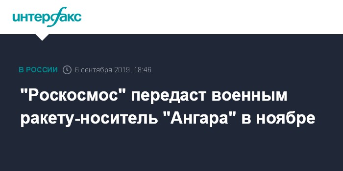 Москва. 6 сентября. INTERFAX.RU - "Роскосмос" передаст Минобороны ракету-носитель "Ангара" в ноябре 2019 года, сообщил журналистам глава госкорпорации Дмитрий Рогозин.