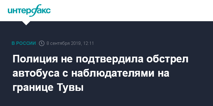 Москва. 8 сентября. INTERFAX.RU - Полицейские не обнаружили следов обстрела автобуса с наблюдателями и журналистами, следующими на выборы в Туву из Красноярского края, сообщает пресс-центр правительства Тувы со ссылкой на и.о. руководителя республиканского МВД Март-оола Тарначы.