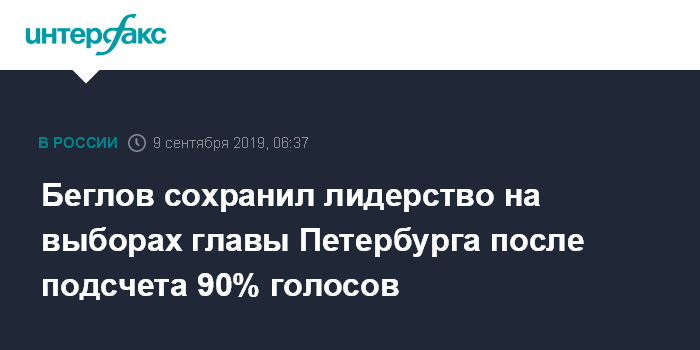 Москва. 9 сентября. INTERFAX.RU - Временно исполняющий обязанности губернатора Санкт-Петербурга Александр Беглов лидирует на выборах главы города после обработки 90,11% протоколов участковых избирательных комиссий, следует из данных Центризбиркома (ЦИК).