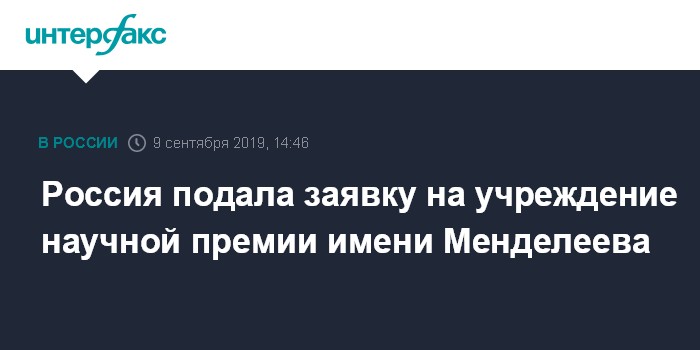 Москва. 9 сентября. INTERFAX.RU - Россия впервые подала в ЮНЕСКО заявку об учреждении научной премии имени Дмитрия Менделеева и рассчитывает на согласие, заявил премьер-министр Дмитрий Медведев. Премию предлагается присуждать за выдающиеся достижения в области химии, физики, математики и биологии двум ученым в год, каждый получит $250 тысяч.
