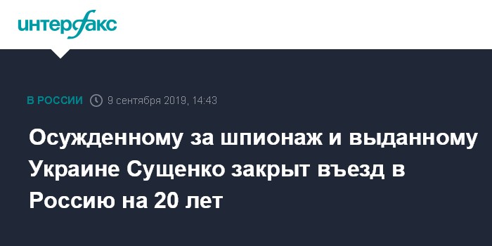 Москва. 9 сентября. INTERFAX.RU - Российская спецслужба запретила осужденному за шпионаж Роману Сущенко, который был выдан Украине в рамках обмена, въезжать в РФ в течении 20 лет.