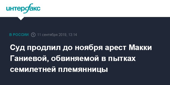 Москва. 11 сентября. INTERFAX.RU - В Ингушетии Магасский районный суд продлил на два месяца срок ареста Макке Ганиевой, сообщил представитель суда. Женщину обвиняют в жестоком избиении семилетней племяннице. У девочки из-за травм начался некроз тканей, и ей пришлось ампутировать руку.