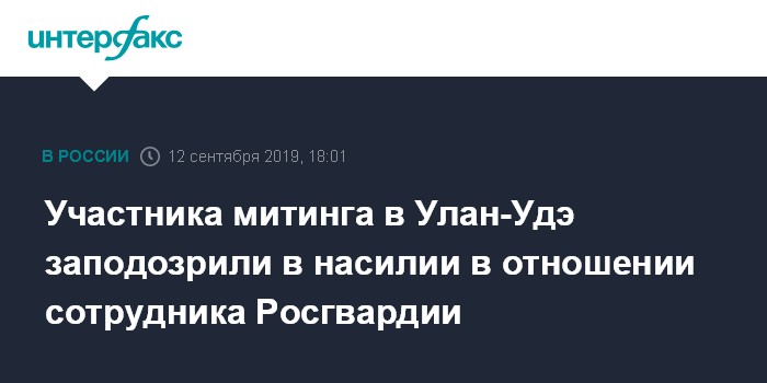 Москва. 12 сентября. INTERFAX.RU - Возбуждено уголовное дело о применении насилия к сотруднику Росгвардии при задержании участников несанкционированного митинга на площади Советов в Улан-Удэ. Об этом сообщает пресс-служба управления Следственного комитета РФ (СКР) по Бурятии.