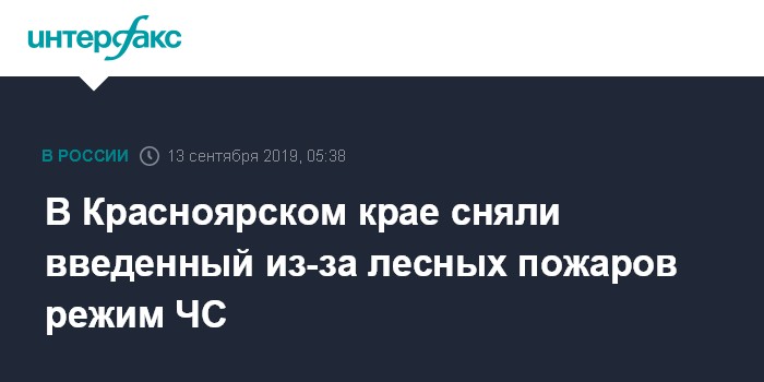 Москва. 13 сентября. INTERFAX.RU - Правительство Красноярского края приняло решение о снятии режима чрезвычайной ситуации, который вводили из-за лесных пожаров, сообщает в пятницу пресс-служба краевого главного управления МЧС.