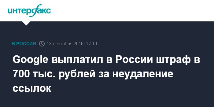 "Компания Google выплатила сумму штрафа в размере 700 тысяч рублей за неисполнение обязанности по прекращению выдачи сведений об информационных ресурсах, доступ к которым ограничивается на территории России", - говорится в сообщении Роскомнадзора, поступившем в "Интерфакс" в пятницу.