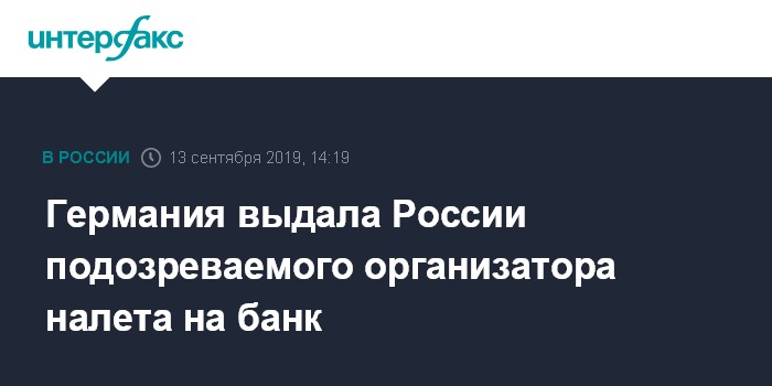 Москва. 13 сентября. INTERFAX.RU - Германия экстрадировала в Россию предполагаемого организатора налета на банк в Петербурге, который был совершен в 2009 году, сообщила пресс-служба Генпрокуратура. Это Георгий Кобахидзе.
