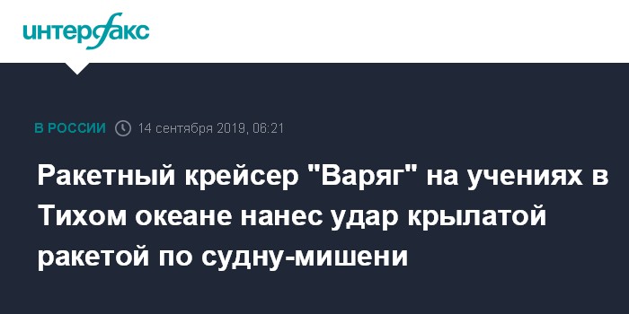 "Флагман Тихоокеанского флота Гвардейский ордена Нахимова ракетный крейсер "Варяг" выполнил пуск крылатой ракеты комплекса "Вулкан" по судну-мишени на дистанции около 500 километров", - говорится в сообщении.