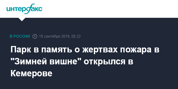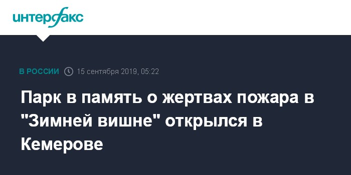 Москва. 15 сентября. INTERFAX.RU - Парк, построенный на месте снесенного комплекса зданий ТРЦ "Зимняя вишня", при пожаре в котором погибли 60 человек, открыт для посетителей, сообщил губернатор Кузбасса Сергей Цивилев в ходе экскурсии для журналистов по "Парку ангелов" воскресенье.