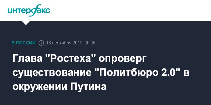Москва. 16 сентября. INTERFAX.RU - Глава "Ростеха" Сергей Чемезов заявил, что в окружении президента Владимира Путина нет неформальной структуры, которую политологи называют "Политбюро 2.0", и никаких собраний для обсуждения и коллегиального принятия решений там не проводится. Он сказал об этом в интервью РБК.