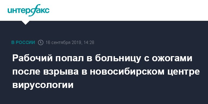 Москва. 16 сентября. INTERFAX.RU - Рабочий, пострадавший из-за взрыва во время ремонта в государственном научном центре (ГНЦ, Новосибирская область) вирусологии и биотехнологии "Вектор", госпитализирован с ожогами, сообщил "Интерфаксу" мэр наукограда Кольцово, где расположен "Вектор", Николай Красников.