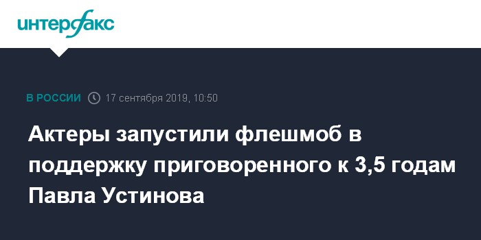 Москва. 17 сентября. INTERFAX.RU - Российские актеры проводят флешмоб в поддержку Павла Устинова, которого Тверской суд 16 сентября приговорил к 3,5 годам колонии за то, что боец Росгвардии при его задержании получил вывих плеча. Акцию запустил актер Театра Маяковского Александр Паль.