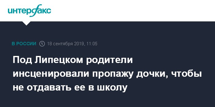 Москва. 18 сентября. INTERFAX.RU - Пропажу восьмилетней девочки из села Паниковец Елецкого района Липецкой области инсценировали ее родители. Об этом сообщает пресс-служба региональной прокуратуры Липецкой области.